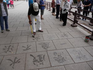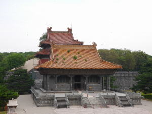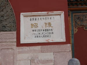 まずは清朝の初代皇帝ホンタイジと皇后孝文端が眠る北稜(昭陵)へ。敷地面積は330万u。門から陵墓近くまでは小さなバス?で移動です。お墓はきれいな円墳です。そこに夫婦で埋葬されています。でも皇后はいわゆる殉葬。皇后しかその栄誉は賜れないと・・・。違和感!中国の朝はどこも同じですが地元の人たちが太極拳や合唱、そして地面に習字など思い思いの朝を楽しんでいました。