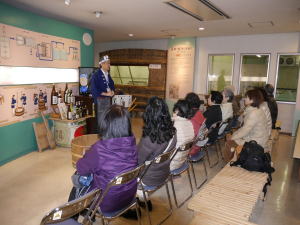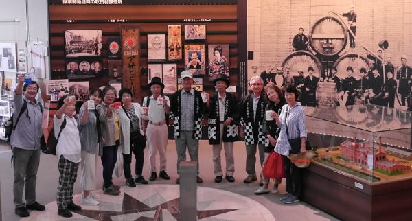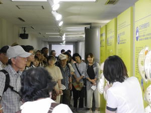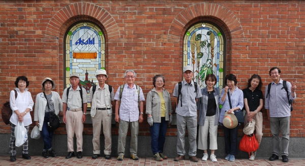 今回は暑気払いということでアサヒビール吹田工場に行ってきました。まずは吹田駅前のイオンでお弁当調達。たくさんあって迷ってしまいました。奈良時代に創建されたという高浜神社、その御旅所、吹田の渡しを経て浜屋敷に到着。ここには吹田のだんじりが収納されており、江戸時代に作られたといだんじりにみなさん見入っていました。そして楽しいお弁当タイム。それぞれ迷いながら買ったお弁当はおいしかったですよ。その後は暑い中をひたすらアサヒの工場へ。このままビールを飲めたら!とはいきませんね。小一時間の工場見学を終えてやっと待ちに待った試飲です。−2℃に冷えたビールや黒ビールは出来立てということもあり本当においしかったです。ほろ酔い気分の中、法被を着たりグラスを持ったりしての集合写真や、韓国の好青年に撮って貰った集合写真など思い出に、アサヒビールを後にしました。