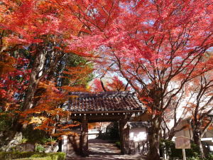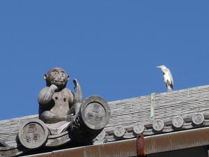 墓所がある西教寺は素晴らしい紅葉。そして本堂の屋根にはアオサギが日向ぼっこでもするように佇んでいました。