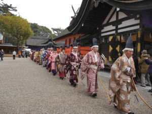 から順に参拝。第一本宮では「お弓神事」という新年行事に遭遇。古式にのっとった弓術を見学することができました。ラッキー!その後境内の摂社などを参拝したあと班別に昼食。事前に予約したお店ではおいしいうどんに全員おなか