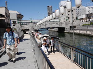 今回は真夏日の26日に16名が参加してミナミの街中をさるきました。道頓堀に沿った遊歩道をひたすら陰を求め