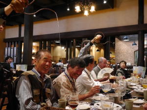 後反省会へ。今回はちょっと豪華な地ビールレストランです。おいしい地ビールや冷酒を注ぐパフォーマンスなども