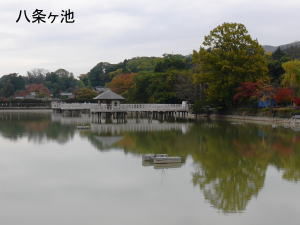 関西さるく会初めての20人越えです。八条ヶ池から趣ある水上橋を通る予定でしたが工事中ということで駐車場側