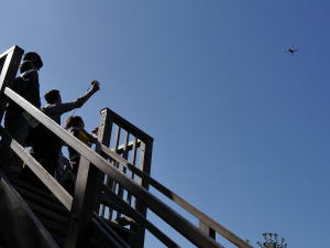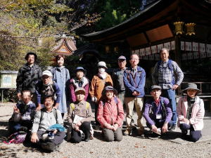 最初の水度神社では檜皮葺の美しい本殿で少し早い七五三のお詣りが目を引く中、記念撮影。その後鴻巣の山展望台を目指します。展望台からは愛宕山・天王山・六甲山が眺望できる絶景スポット。さらにKさんがドローンを飛行させてくれます。初めて見るドローンに参加者と言わず、居合わせたハイカーまでも感激。指さしたり、写真を撮ったり、瞬く間にドローンさるくに!(もちろん城陽市役所、神社の承諾済みです。)